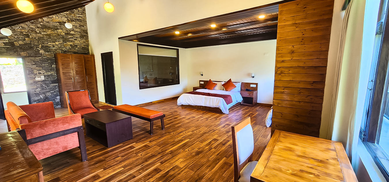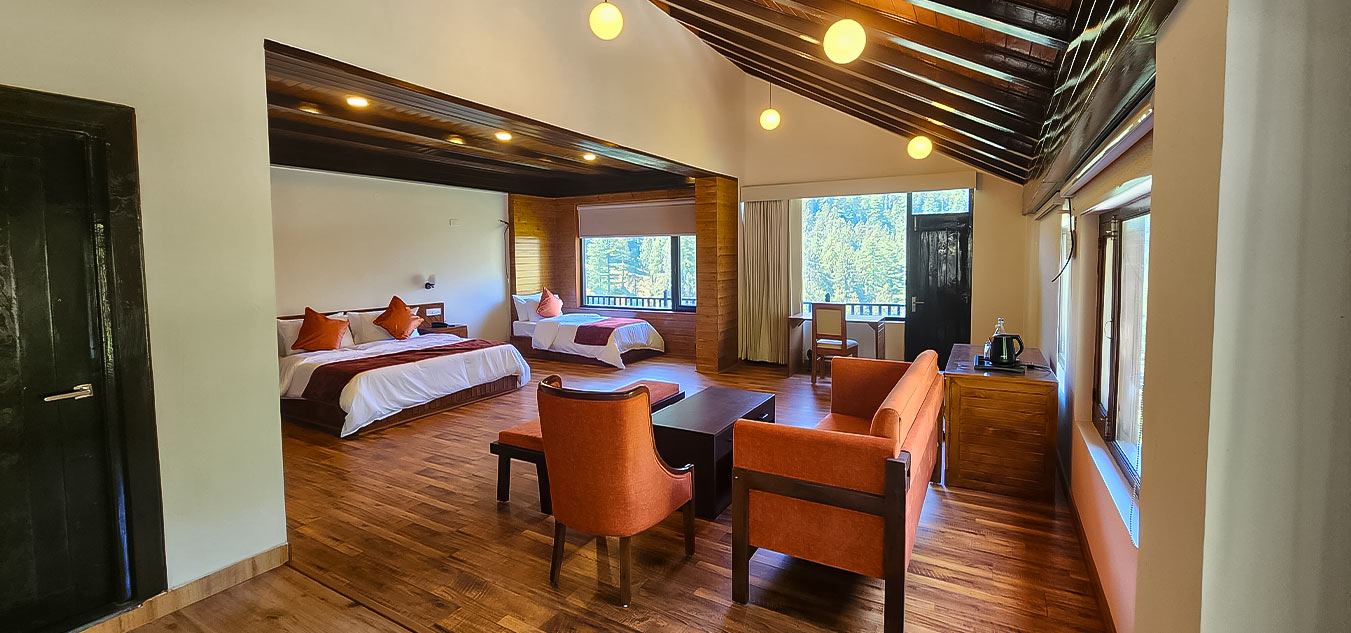 At Manali Se, space and comfort come together in our two expansive suites, designed for those who love a blend of luxury and nature. These suites feature a wraparound balcony that opens to breathtaking views of the valley and endless pine forests.